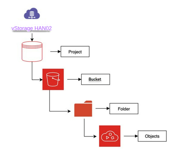 Trên region HAN02 của vStorage, một object là một tập tin và bất kỳ metadata nào mô tả tập tin đó. Một bucket là một thùng chứa cho các objects. Để lưu trữ dữ liệu của bạn trong vStorage, trước tiên bạn tạo một project và chỉ định tên project, gói lưu trữ cũng thông qua vStorage Portal. Sau đó bạn cần sử dụng 3rd party softwares để kết nối và tạo một hoặc nhiều bucket bên trên project vừa tạo. Lúc này, bạn tải object của mình lên bucket đó dưới dạng object trong vStorage. Mô hình tổ chức lưu trữ của vStorage được chúng tôi mô tả bên dưới.