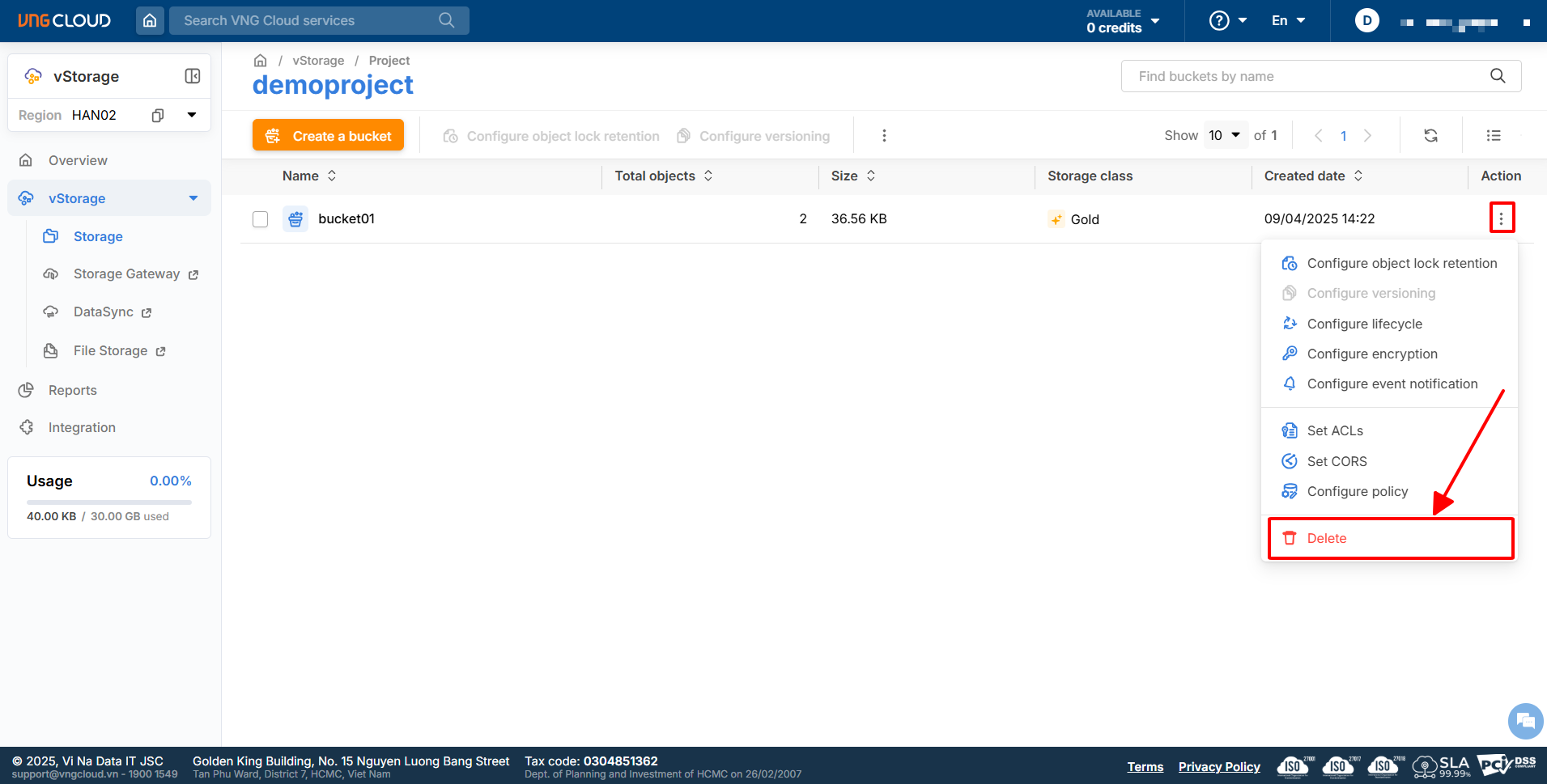 Để xóa một bucket, vui lòng thực hiện theo các bước bên dưới: