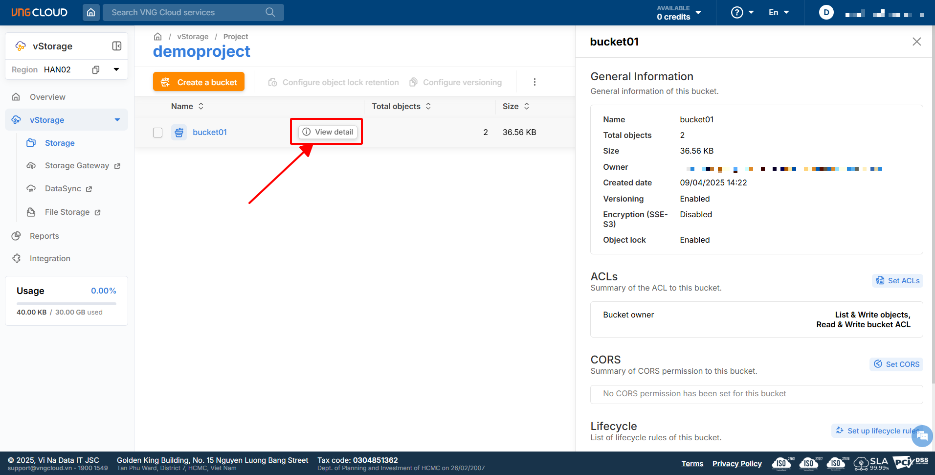 Sau khi tạo bucket và tải lên object vào bucket đó. Bạn có thể xem chi tiết thông tin bucket và sử dụng các tính năng mà chúng tôi cung cấp cho bucket bao gồm: ACLs, Lifecycle, CORS,...