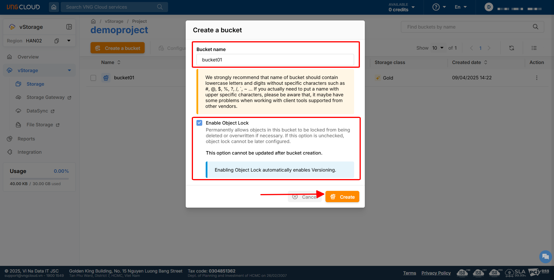 * Để sử dụng tính năng **Object locked** cho một bucket trên vStorage, khi khởi tạo bucket, bạn bắt buộc phải lựa chọn **Enable Object Locked**.