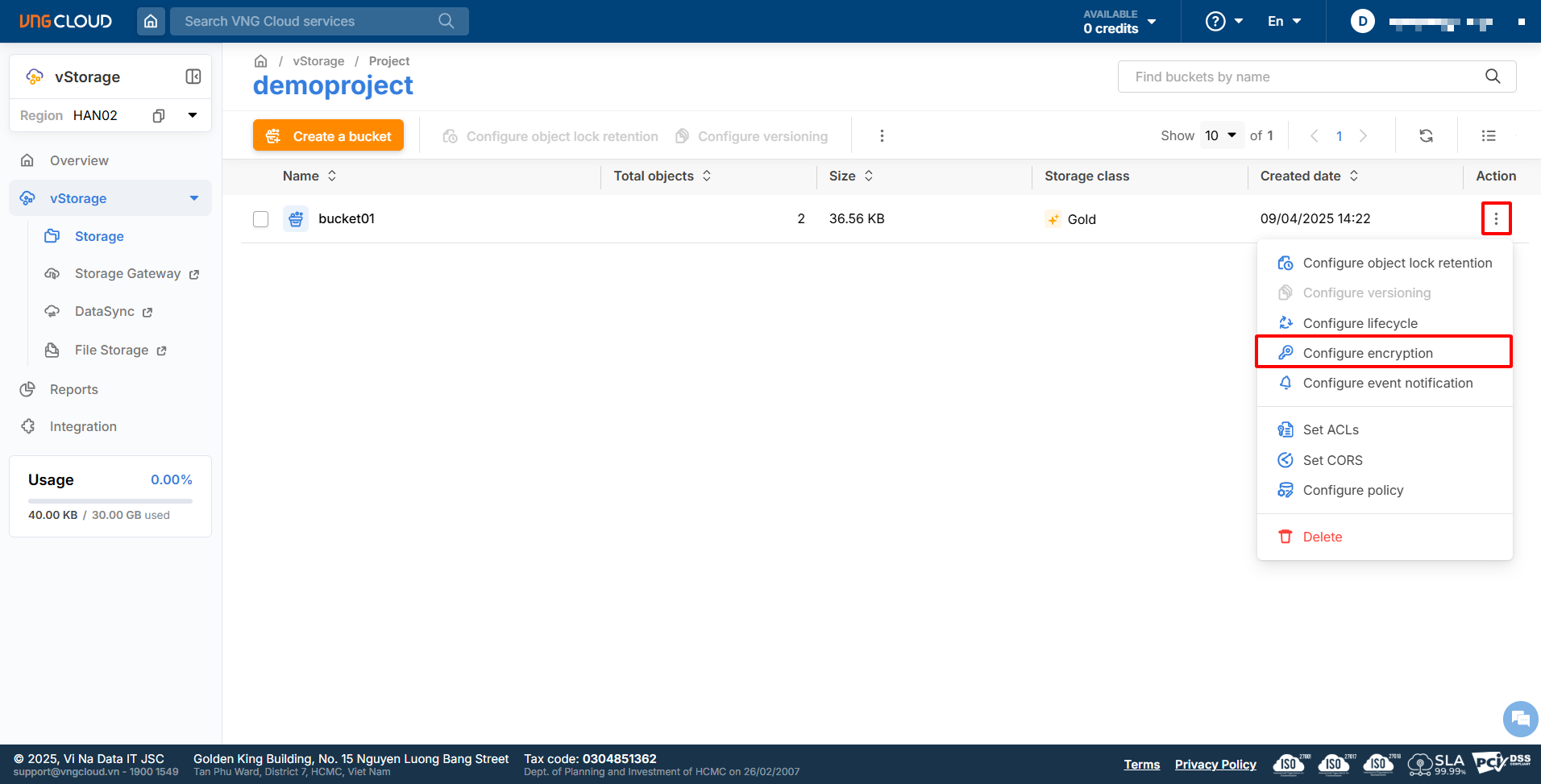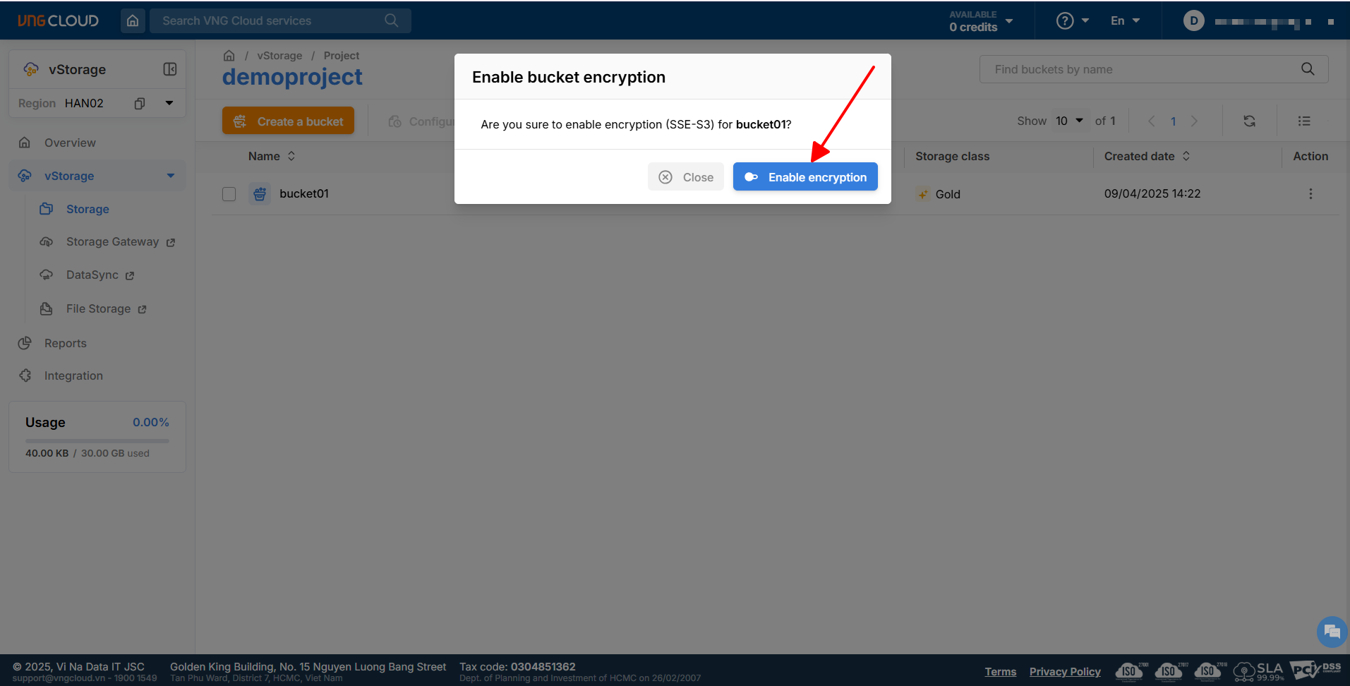 Để sử dụng tính năng Bucket encryption, vui lòng thực hiện theo các bước bên dưới: