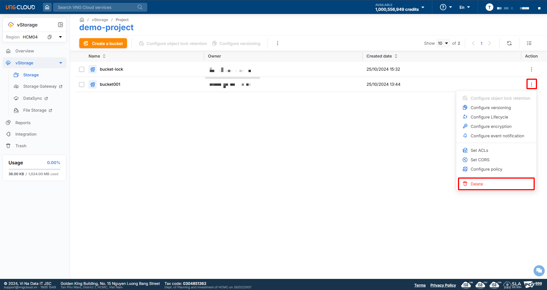Để xóa một bucket, vui lòng thực hiện theo các bước bên dưới: