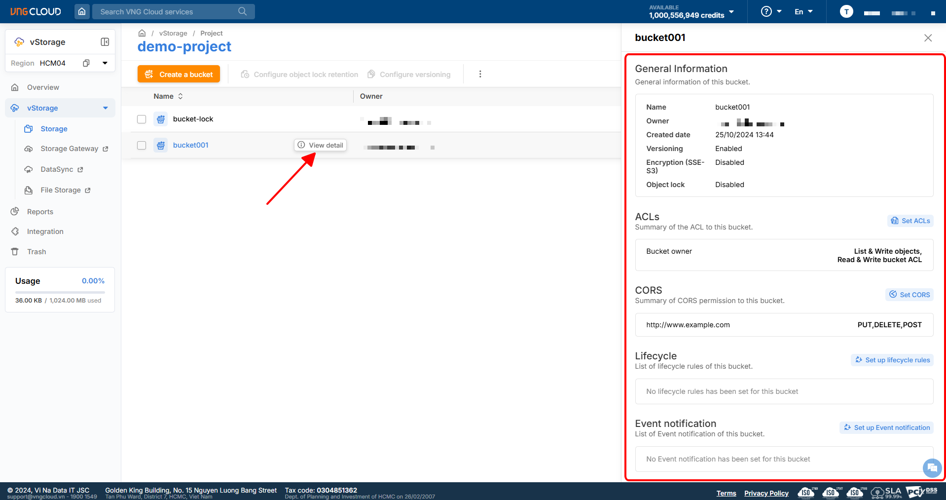 Sau khi tạo bucket và tải lên object vào bucket đó. Bạn có thể xem chi tiết thông tin bucket và sử dụng các tính năng mà chúng tôi cung cấp cho bucket bao gồm: ACLs, Lifecycle, CORS,...