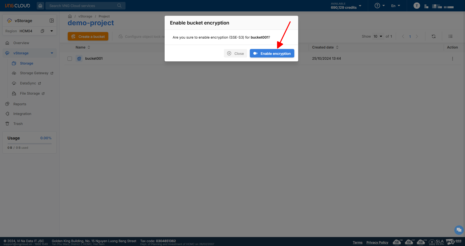 Để sử dụng tính năng Bucket encryption, vui lòng thực hiện theo các bước bên dưới: