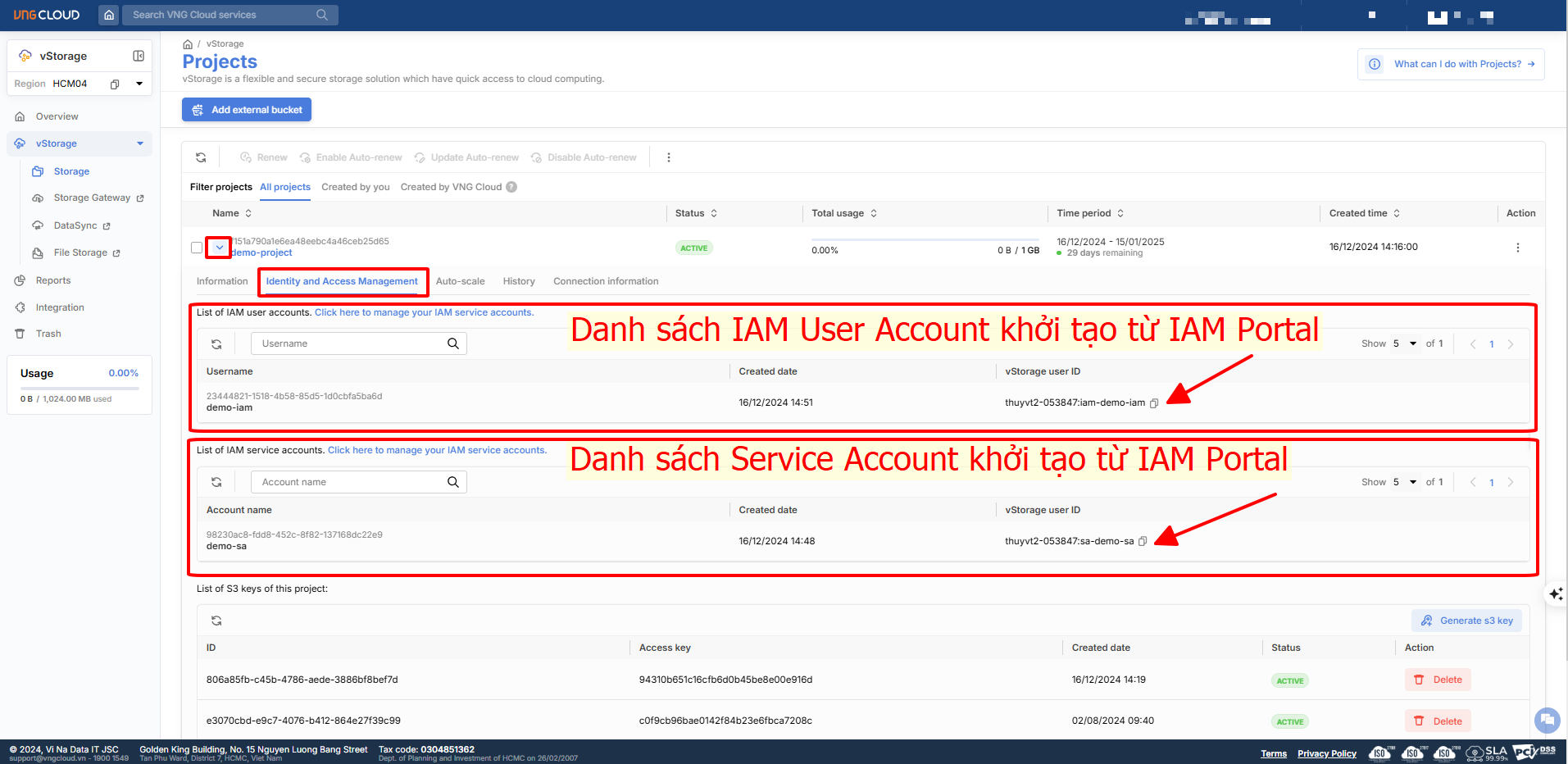 * **S3 keys:** Là cặp s3 key có access key và secret key được vStorage tích hợp để có tính tương thích với các client tool của S3 như s3cmd, s3 SDK,...