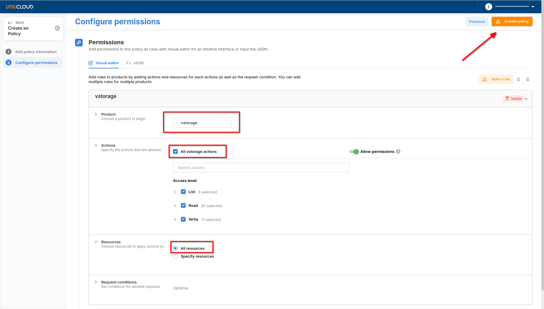 2. Chọn <mark style="background-color:blue;">**All vstorage actions**</mark> nếu muốn tạo policy có quyền thực hiện tất cả các hành động trên vStorage. Hoặc bạn có thể chọn một số hành động cụ thể mà bạn muốn phân quyền cho IAM User Account.