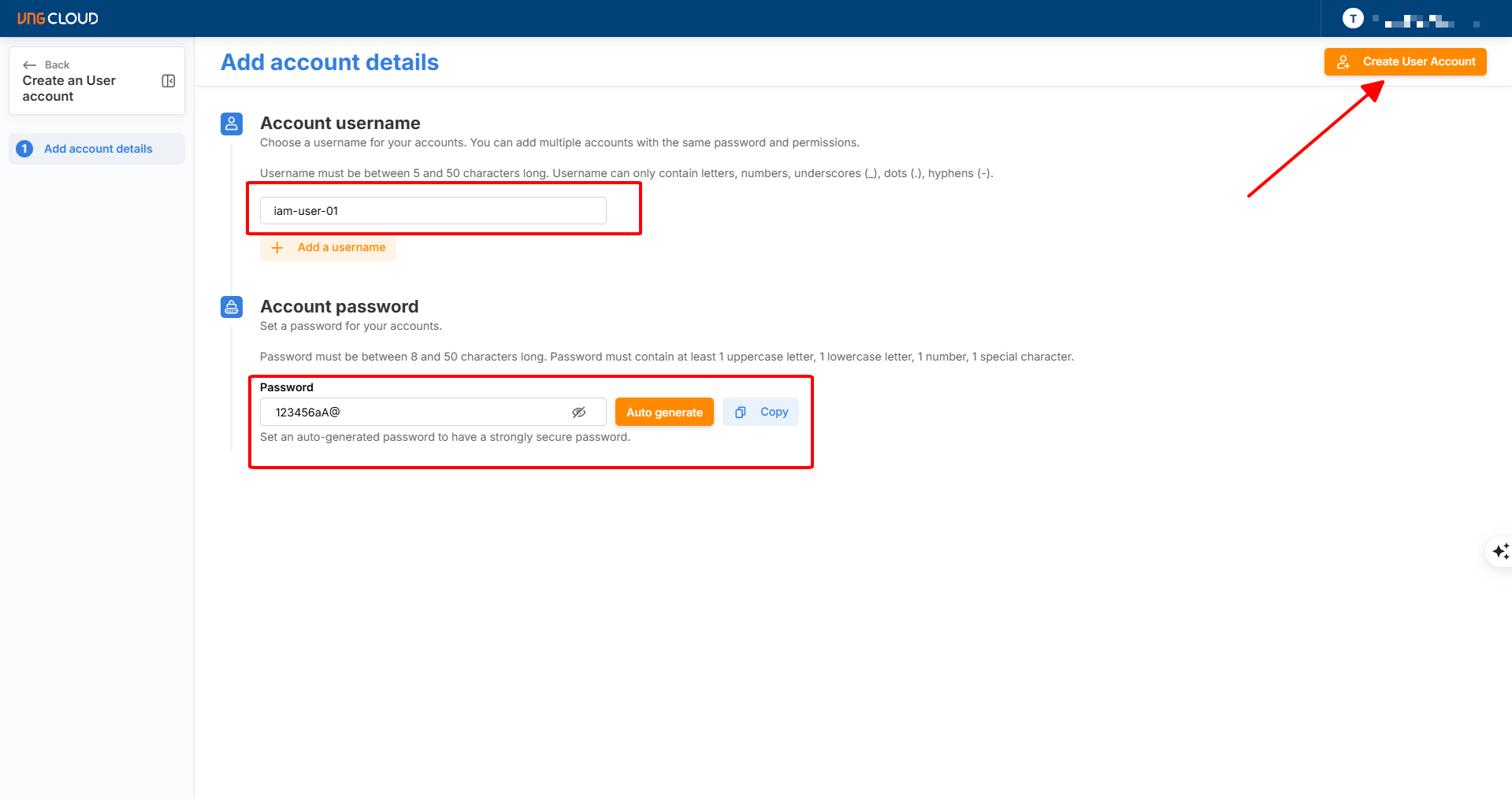 4. Tại mục **Account username**, nhập **Account username** mà bạn mong muốn. Tên của IAM User Account phải dài từ 5 (tối thiểu) đến 50 (tối đa) ký tự và chỉ có thể bao gồm các chữ cái viết hoa, viết thường (a-z, A-Z), số (0-9), dấu chấm (.), dấu gạch dưới (\_), dấu gạch ngang (-). Tên của IAM User Account không nên chứa các thông tin nhạy cảm (ví dụ địa chỉ IP, mật khẩu đăng nhập,...) cũng như tên IAM User Account phải là duy nhất trên một tài khoản GreenNode cho đến khi IAM User Account đó bị xóa. Ví dụ tên IAM User Account sau là hợp lệ: IAM\_Phong\_kinh\_doanh\_01.