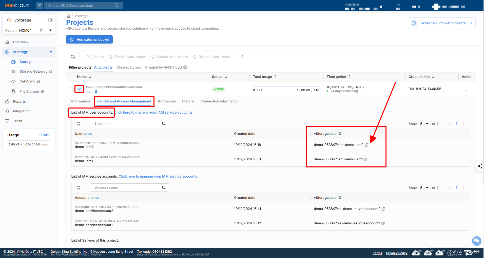 3. Tại mục **Identity and Access Management**, thực hiện sao chép thông tin **vStorage User ID** tại mục **List of IAM User Account**.