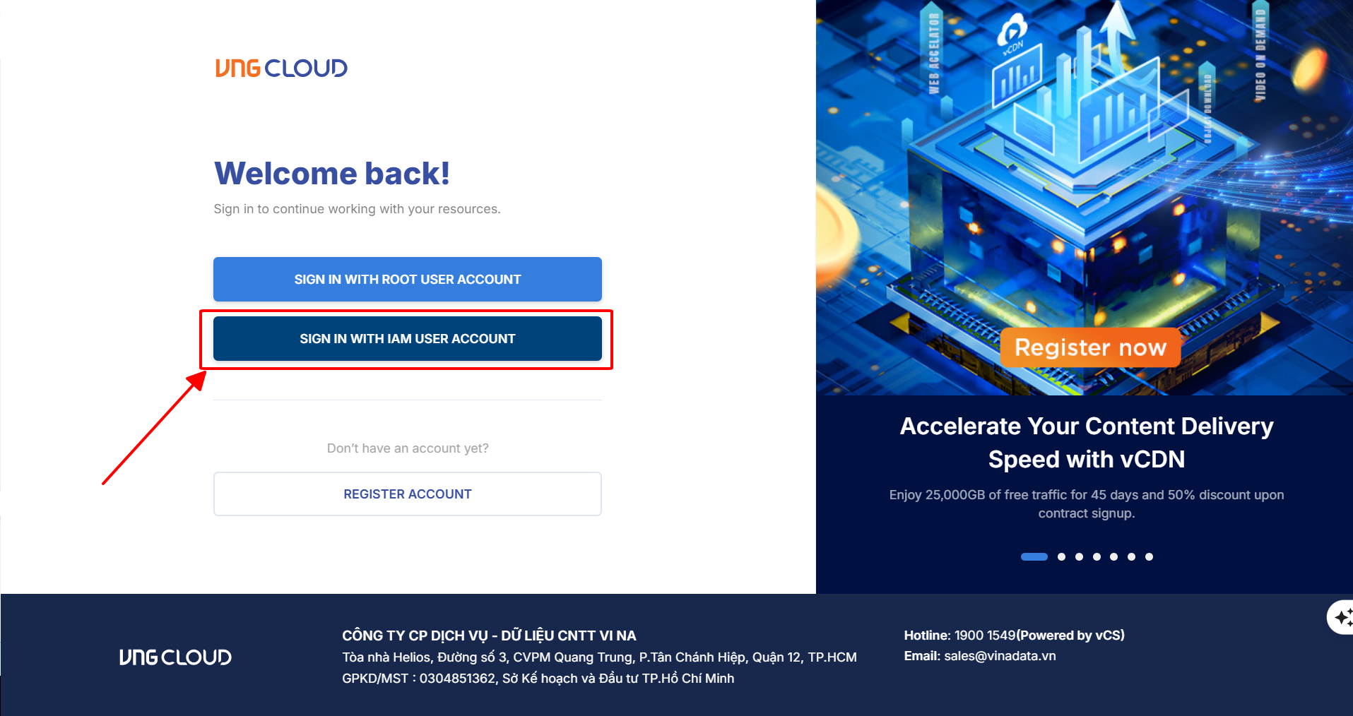 Thực hiện theo các bước bên dưới để đăng nhập vào vStorage với tài khoản người dùng IAM: