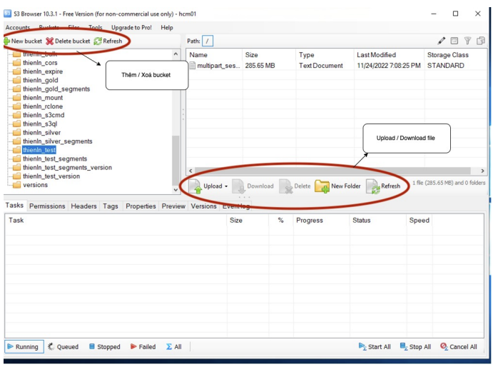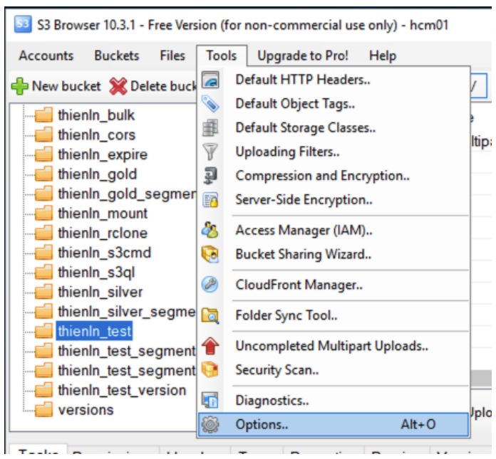 S3 Browser có hỗ trợ dọn incomplete segments khi tải object lớn (multipart upload). Khi bạn sử dụng S3 Browser để tải lên tệp tin lớn (multipart upload), tệp tin được chia thành nhiều segment để tải lên hệ thống vStorage. Trong quá trình tải của tệp tin, có thể có một số segment được tải lên, một số segment không được tải lên do gặp lỗi như network có vấn đề, hệ thống vStorage đang quá tải, S3 Browser của bạn bị dừng chạy, treo, v.v. Tệp tin khi đó được xem như tải lên không thành công, các segment đã được tải lên được xem như là các incomplete segment hay là segment rác và đang chiếm dụng dung lượng lưu trữ của bạn. Chúng tôi khuyến cáo bạn thực hiện xóa bỏ những segment rác này để tối ưu hóa chi phí và dung lượng lưu trữ bằng cách: