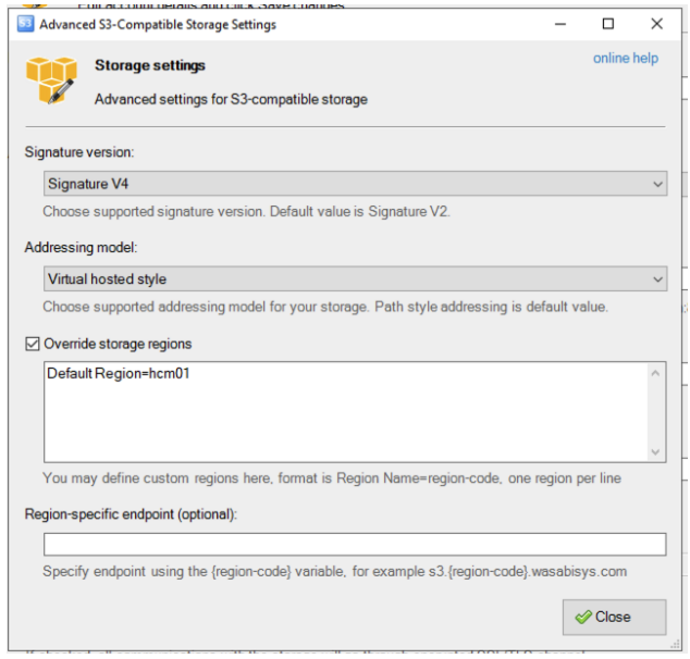 * Chọn **Override storage region**: điền vào giá trị của Default region = hcm03.
