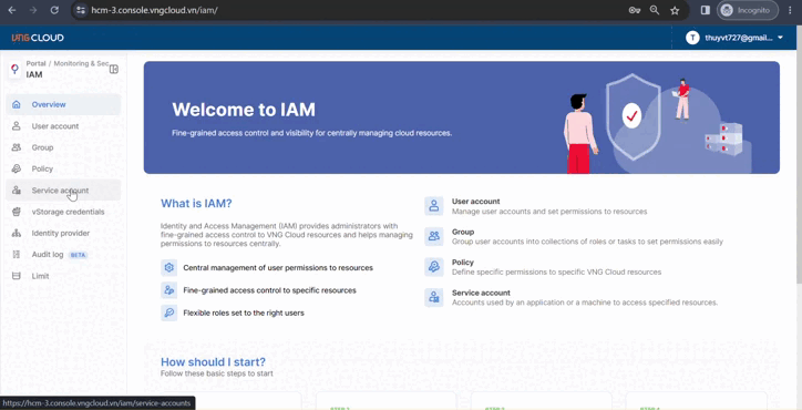 1. Chọn 1 hoặc nhiều policy mà bạn đang có để liên kết với Service Account. Hệ thống vIAM hỗ trợ bạn gán nhiều policy vào một tài khoản Service Account. Nếu các policy này chứa các quyền hạn độc lập thì chúng sẽ bổ sung cho nhau (tức là danh sách quyền hạn được hợp lại). Ngược lại nếu các policy này chứa các quyền hạn trái ngược thì bạn sẽ không thể truy cập vào tài nguyên tương ứng theo danh sách quyền hạn này (tức là danh sách quyền được hợp lại và khi trái ngược thì sẽ triệt tiêu nhau). Chi tiết tham khảo thêm tại [Liên kết tài khoản Service Account với policy tương ứng](https://docs.vngcloud.vn/vng-cloud-document/vn/vstorage/object-storage/vstorage-hcm03/quan-ly-truy-cap/quan-ly-tai-khoan-truy-cap-vstorage/tai-khoan-service-account/lien-ket-tai-khoan-service-account-voi-policy-tuong-ung).