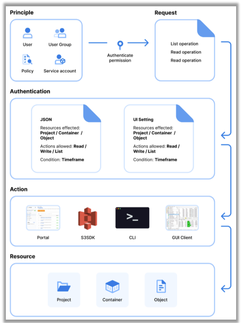 Các chủ đề trong phần này mô tả các thành phần cơ bản của vIAM, nhấn mạnh vào các chi tiết cụ thể của việc cấu hình phân quyền truy cập tài nguyên trên vStorage thông qua vIAM đồng thời cung cấp ví dụ về container và policy của người dùng. Trước tiên, chúng tôi khuyên bạn nên xem lại các chủ đề giới thiệu các khái niệm cơ bản và các tùy chọn có sẵn để bạn quản lý quyền truy cập vào tài nguyên vStorage của mình.
