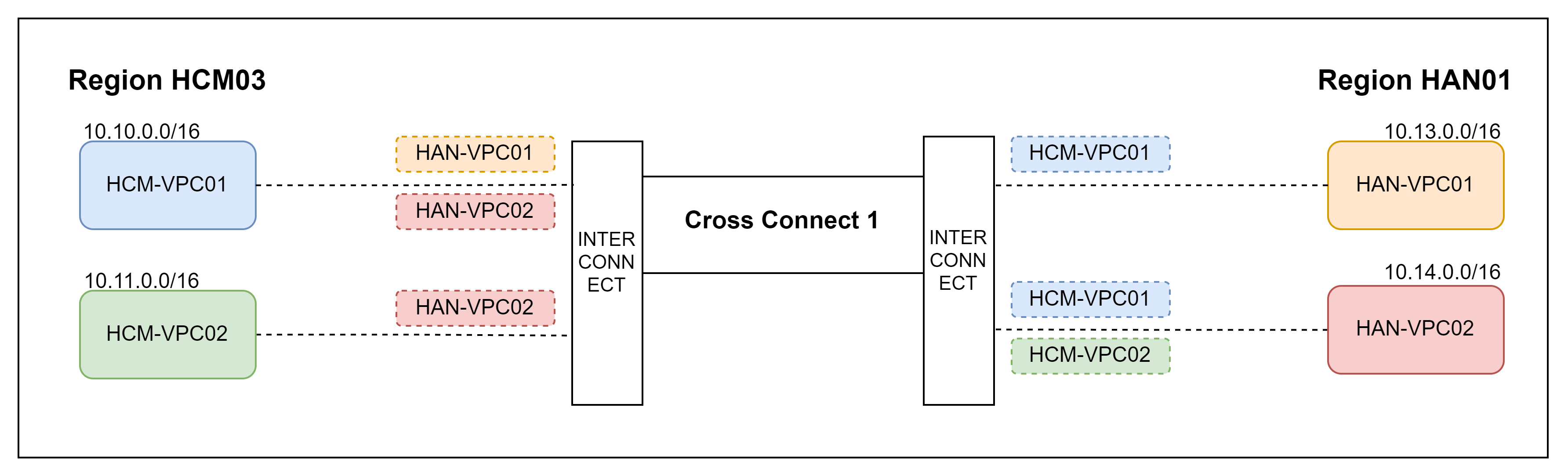 To understand the VPC connection between two regions, see the detailed description below of a Cross Connect between two VPCs in the Hanoi and Ho Chi Minh regions: