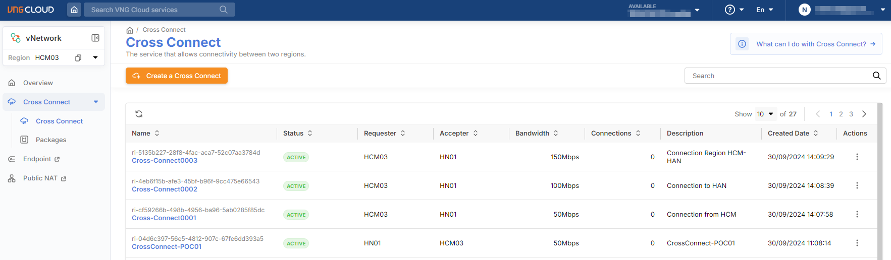 * During the setup process for this Cross Connect, the system requires time to authenticate between the two regions, so it <mark style="color:blue;">**may take up to 20 minutes to complete**</mark>. Once the system finishes processing, the status will automatically change to '<mark style="color:blue;">**Active**</mark>.'