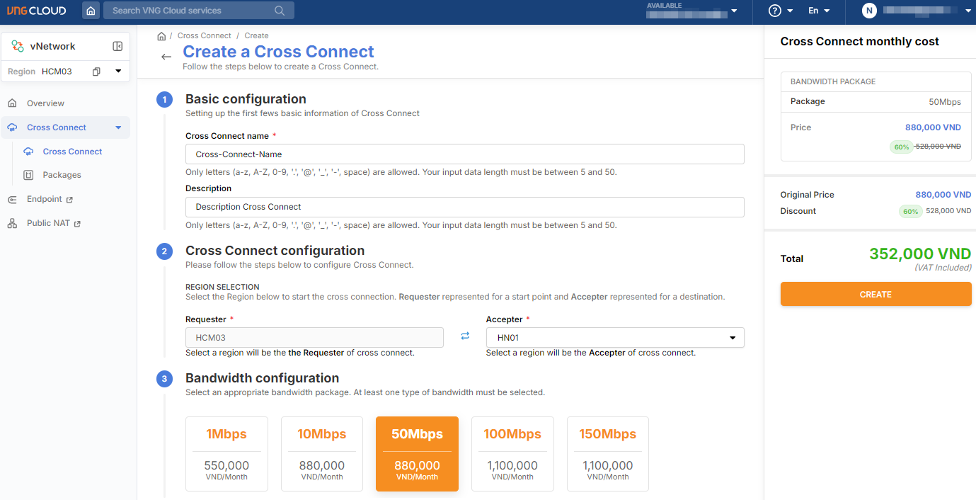 **Step 6:** On the right side of the screen, review the package summary and bandwidth costs to create the Cross Connect, then click '**Create**' to confirm and proceed with payment;