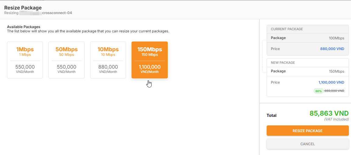**Step 6:** After selecting the appropriate package, users can view a summary of the additional costs or the refund amount in case of selecting a lower bandwidth package. Press the "<mark style="color:blue;">**Resize Package**</mark>" button to complete. When the status of CrossConnect changes from '<mark style="color:blue;">**Changing**</mark>' back to '<mark style="color:blue;">**Active**</mark>', the bandwidth resize process is completed.