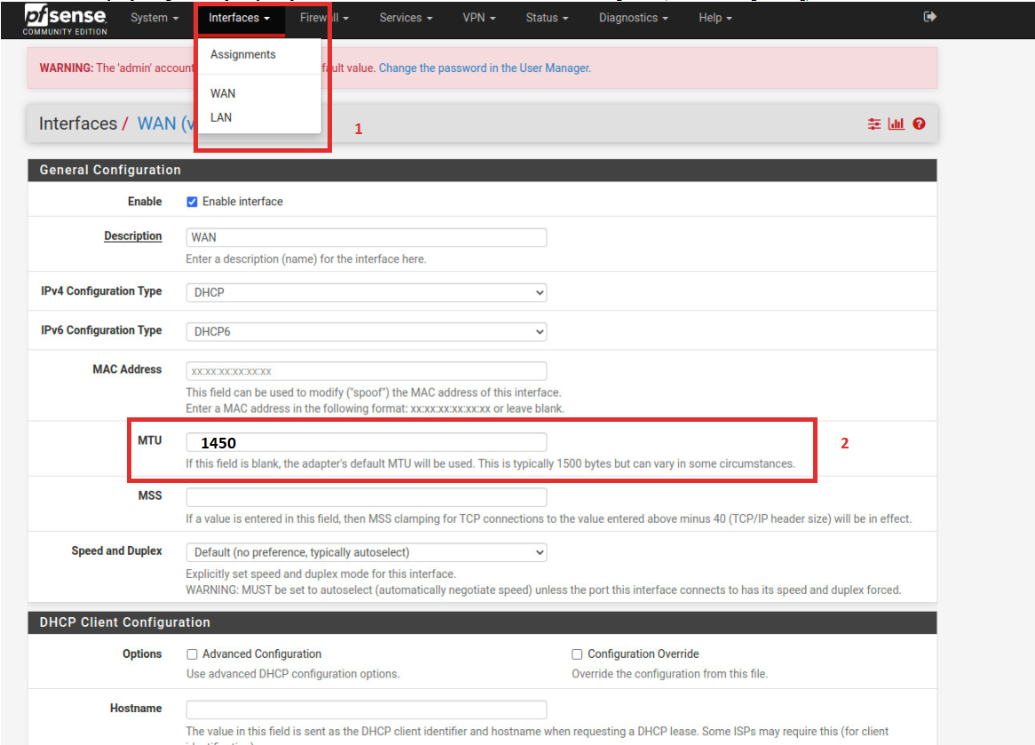 **Step 1: Access the pfSense management interface, select the "Interfaces" tab, and configure the WAN (or LAN in use) network one by one.**