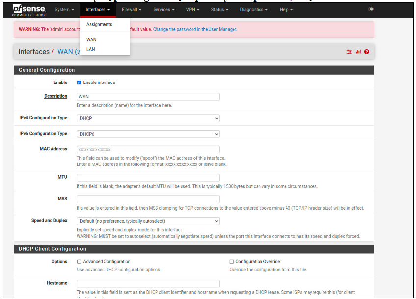 **Step 1: Access the pfSense management interface, select the "Interfaces" tab, and configure the WAN and LAN networks one by one.**