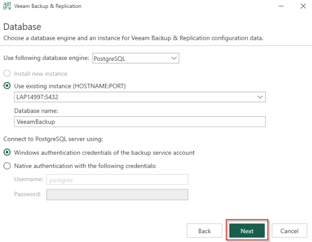 7. Enter the SQL server-DB information for Veeam, then click "**Next**."