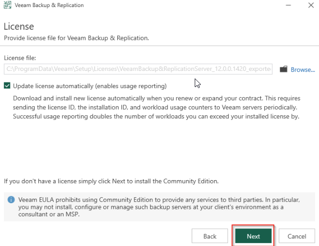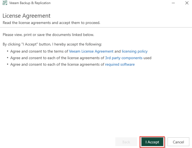 4. Veeam Backup & Replication software advises customers to read the information regarding the software's license agreement and terms of use. If they agree, customers can click "**I Accept**" to continue.