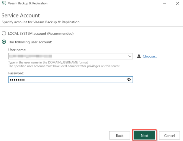 6. Enter the Local System Account information or specify an account with server permissions, then click "**Next**".