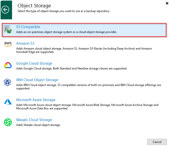 **Step 4:** In the Object Storage screen, choose the "**S3 Compatible**" option or select the appropriate object choice for backup.