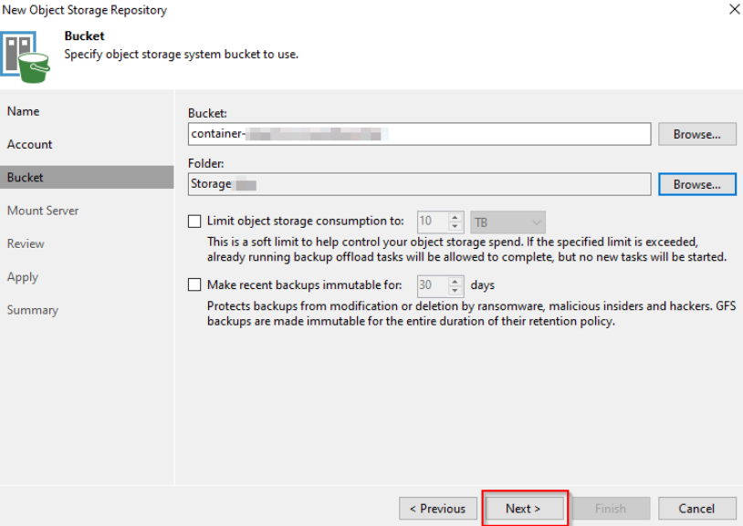 7. In the "Bucket" step, select the **Bucket and folder** to back up the data to. Then click "**Next**";