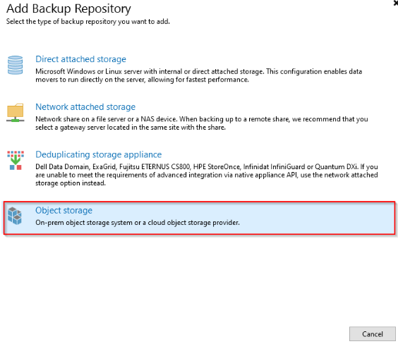 **Step 3**: In the Add Backup Repository screen, select the "**Object storage**" option.