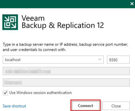 1. Open Veeam Backup & Repository software, enter login information, and click "**Connect**";