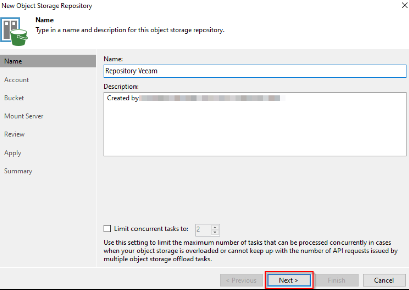 **Step 5:** Navigate to the "New Object Storage Repository" screen to start creating the Repository (backup location). In the "**Name**" step, users set the name and description for the Repository. Then click "**Next**".