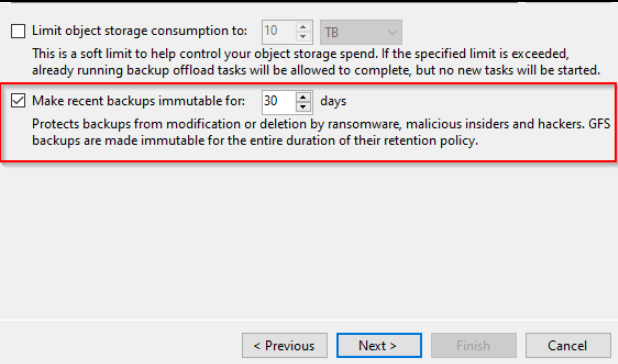 * You need to select the option: "<mark style="color:red;">**Make recent backups immutable for (30) days**</mark>";