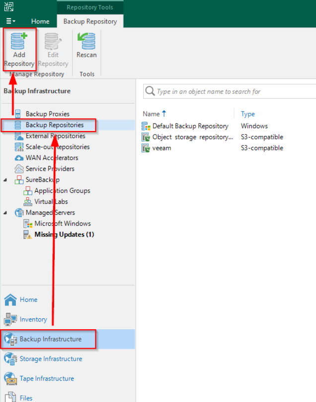 2. In "Backup Infrastructure", select "**Backup Repositories**", then click the "**Add Repository**" button;