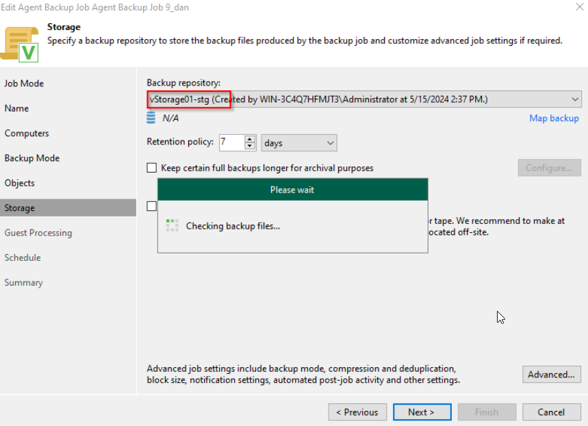 **Step 7:** In the **Storage** tab, the user selects the previously created **Backup Repository**, then press **Next**. The system will check the backup file.