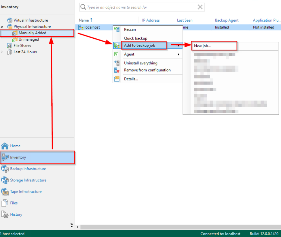 **Step 1**: Users go to the **Inventory** section, select Object - Computer (infrastructure to be backed up), in this guide localhost is the Object to be backed up, then right-click on the Object to select "Add to backup job" and press "**New Job**".