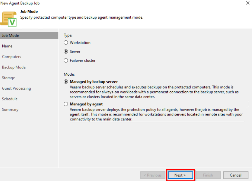 **Step 2:** The **New Agent Backup Job** interface appears, in the **Job Mode** tab, the user selects the Mode "**Managed by backup server**", then press **Next**.
