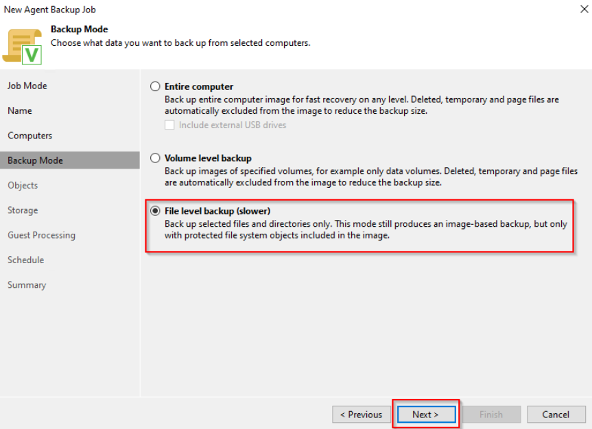 **Step 5:** In the **Backup Mode** tab, the user chooses the mode "**File level backup (slower)**" to backup only selected files or folders, or if backing up the entire computer then choose the mode "Entire computer". Then press **Next**.
