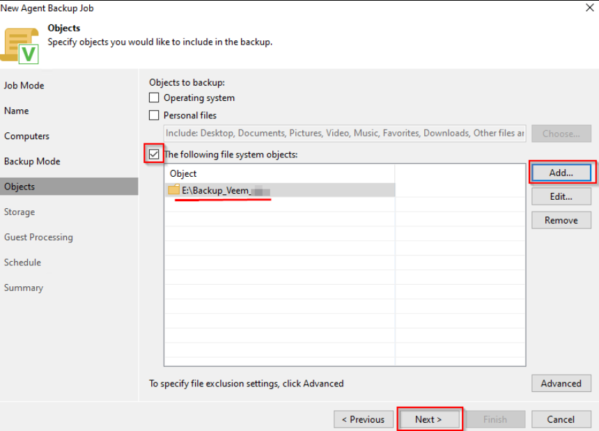**Step 6:** If the "File level backup (slower)" mode is chosen in step 5, then the **Object** tab appears to select the objects to backup, the user chooses the option "**The following file system objects**:", then press "Add" to enter the path of the folder to backup, then press "OK" and finally press **Next**.