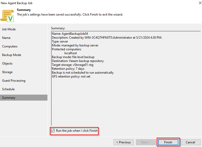 **Step 10:** In the Summary tab, the user can see a summary of the Job information to be created, choose "**Run the job when I click Finish**" then press **Finish** for the system to start creating the Job.