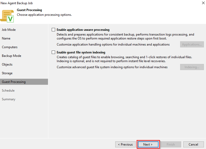 **Step 8:** After the system finishes checking, navigate to the **Guest Processing** tab, the user **deselects the first option "Enable application-aware processing"**. If the user wants to ensure consistent backups for applications running on virtual servers by interacting with them and using Microsoft VSS, then it can still be enabled and Veeam will have to perform pre and post backup tasks. Then press **Next**.