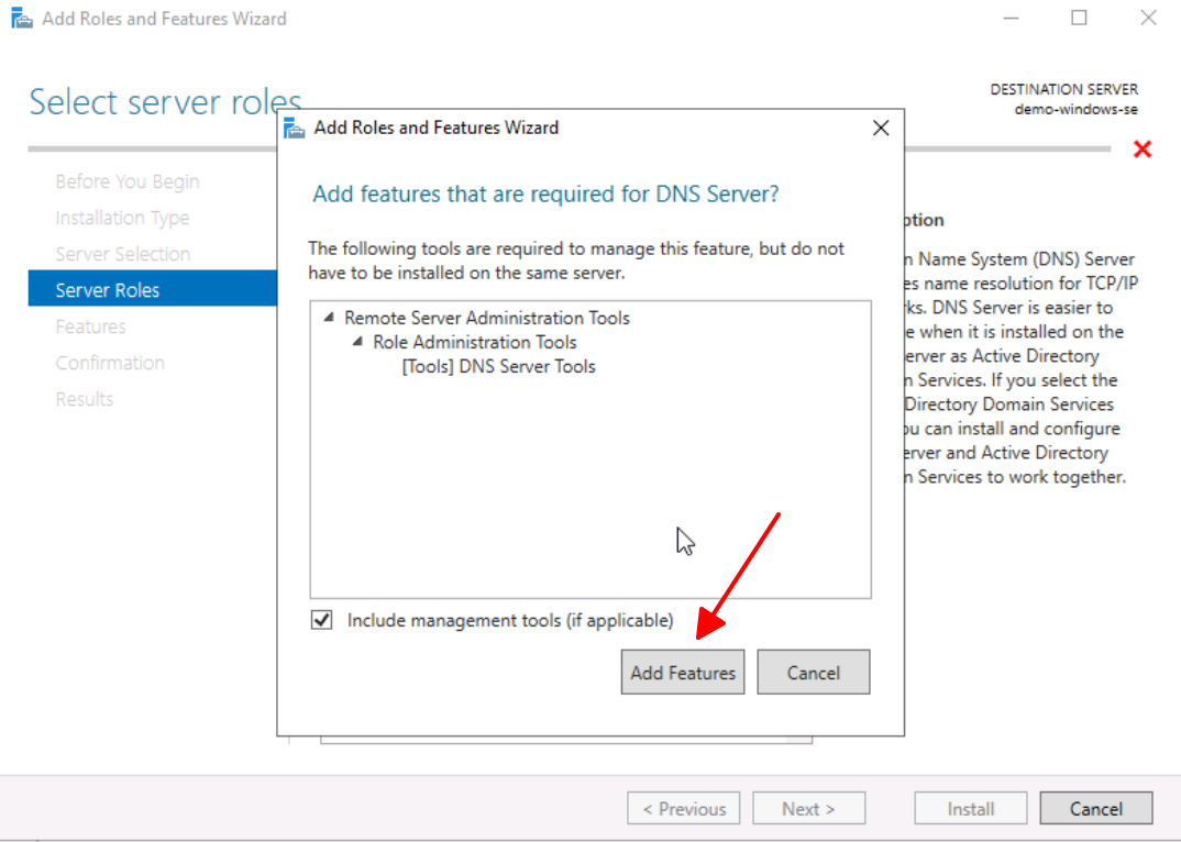 7. At this point, you will be prompted to add the necessary features for the DNS Server, select **Add Features** if you agree with the defaults.