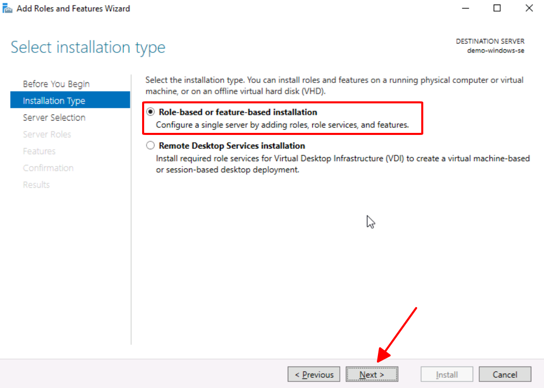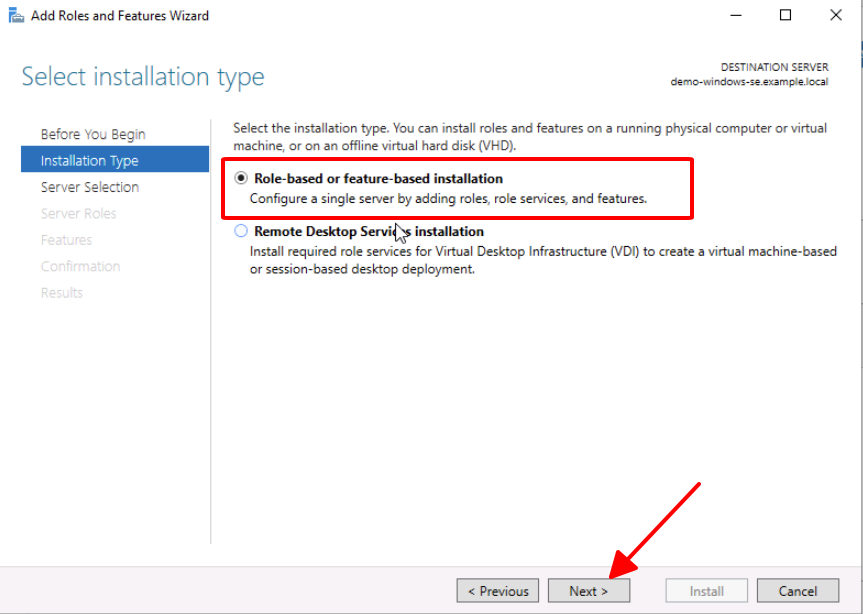 4. On the **Installation Type** page : Select **Role-based or feature-based installation** then select **Next**