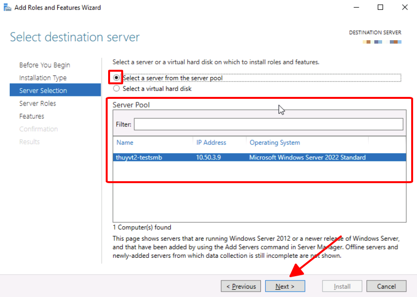 5. In **Server Selection** : select **Select a server from the server pool** and **select the current server** then select **Next**