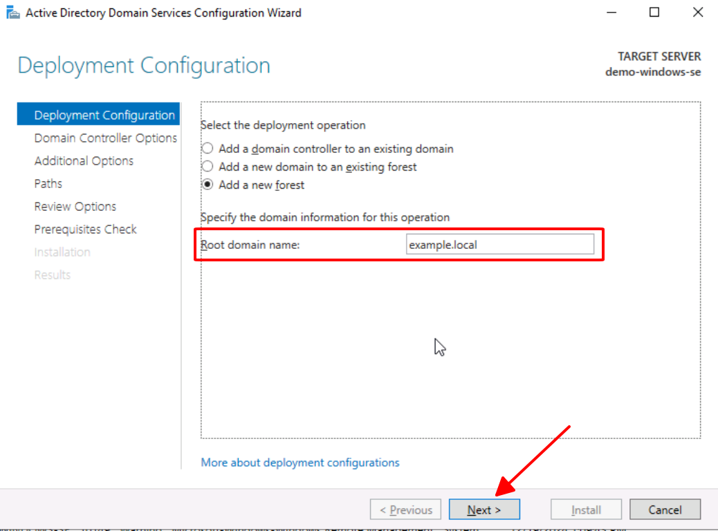 * **Active Directory domain name** : This is **the Root domain name** you created in the step of **Installing and configuring Active Directory Domain Services** . For example:`example.local`