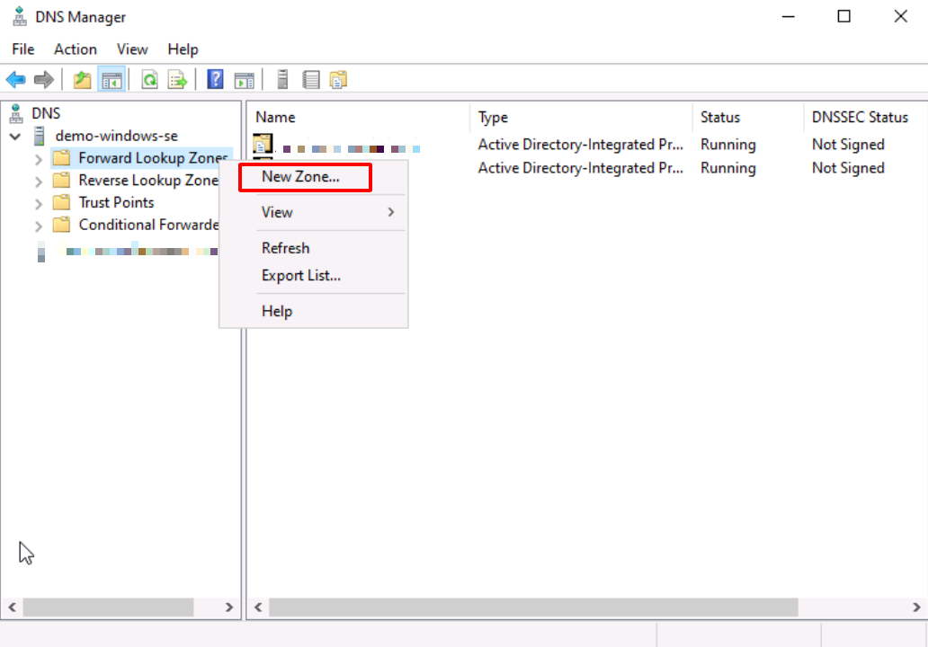 2. In DNS Manager, select the existing DNS and continue to right-click on **Forward Lookup Zones** and select **New Zone**