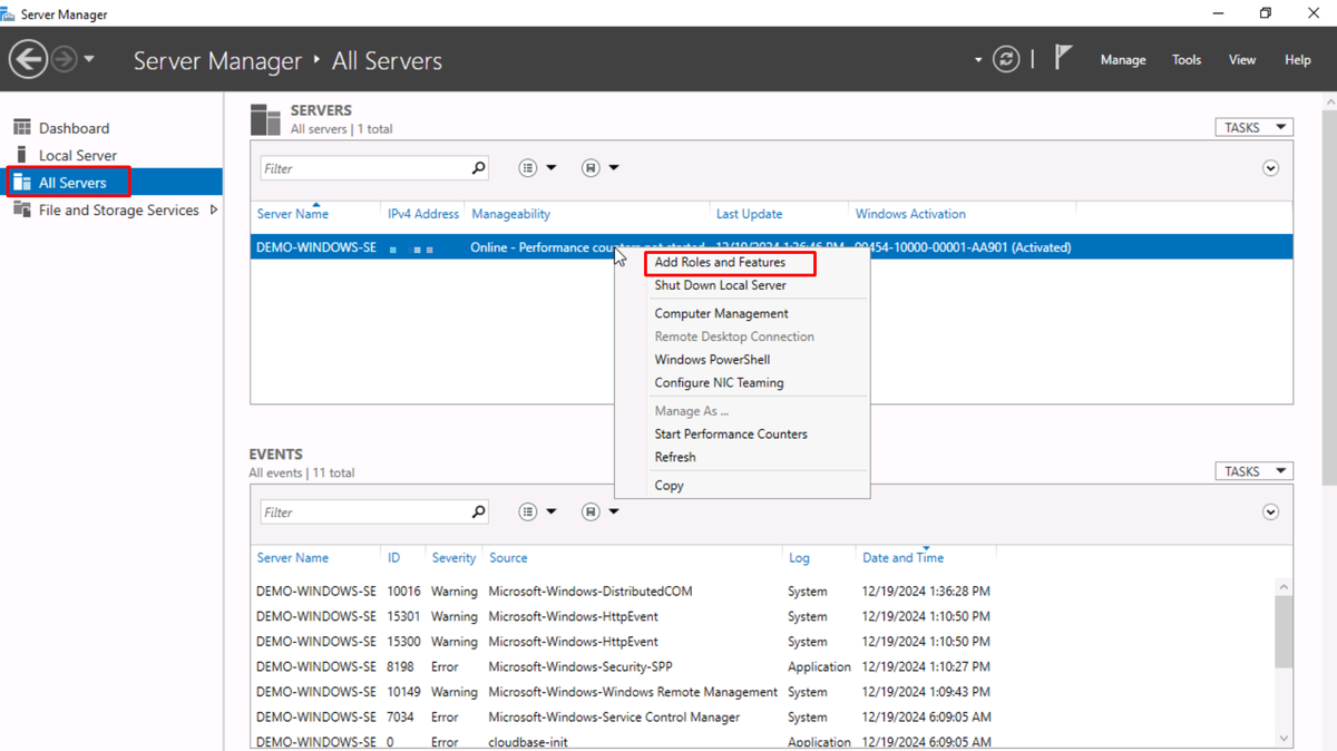 2. Select **All Servers,** right click then select **Add roles and Features**