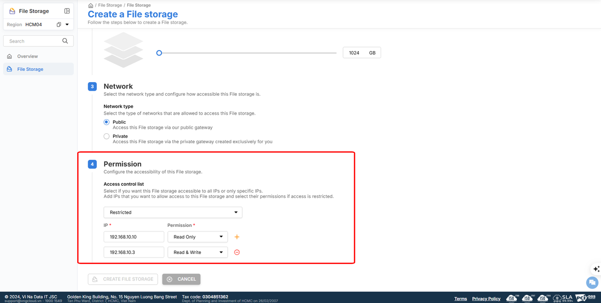 File Storage Max quota: in the file storage initialization step, you need to set a maximum quota limit for that file storage. This quota means the limit of storage capacity that the file storage can use, helping to manage resources effectively. The minimum quota you need to choose is 1 TB and the maximum quota we provide is 50 TB. If you need to use more than 50 TB for a file storage, please contact us.