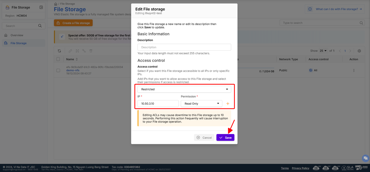 * **For NFS file storage** : Allow editing access rights (ACL) directly on the file by selecting **Edit** on the storage file you want to edit. However, editing ACL can cause disruption to this storage File for up to **10 seconds** . <mark style="color:red;">**Performing this action frequently will cause disruption to your storage File.**</mark>
