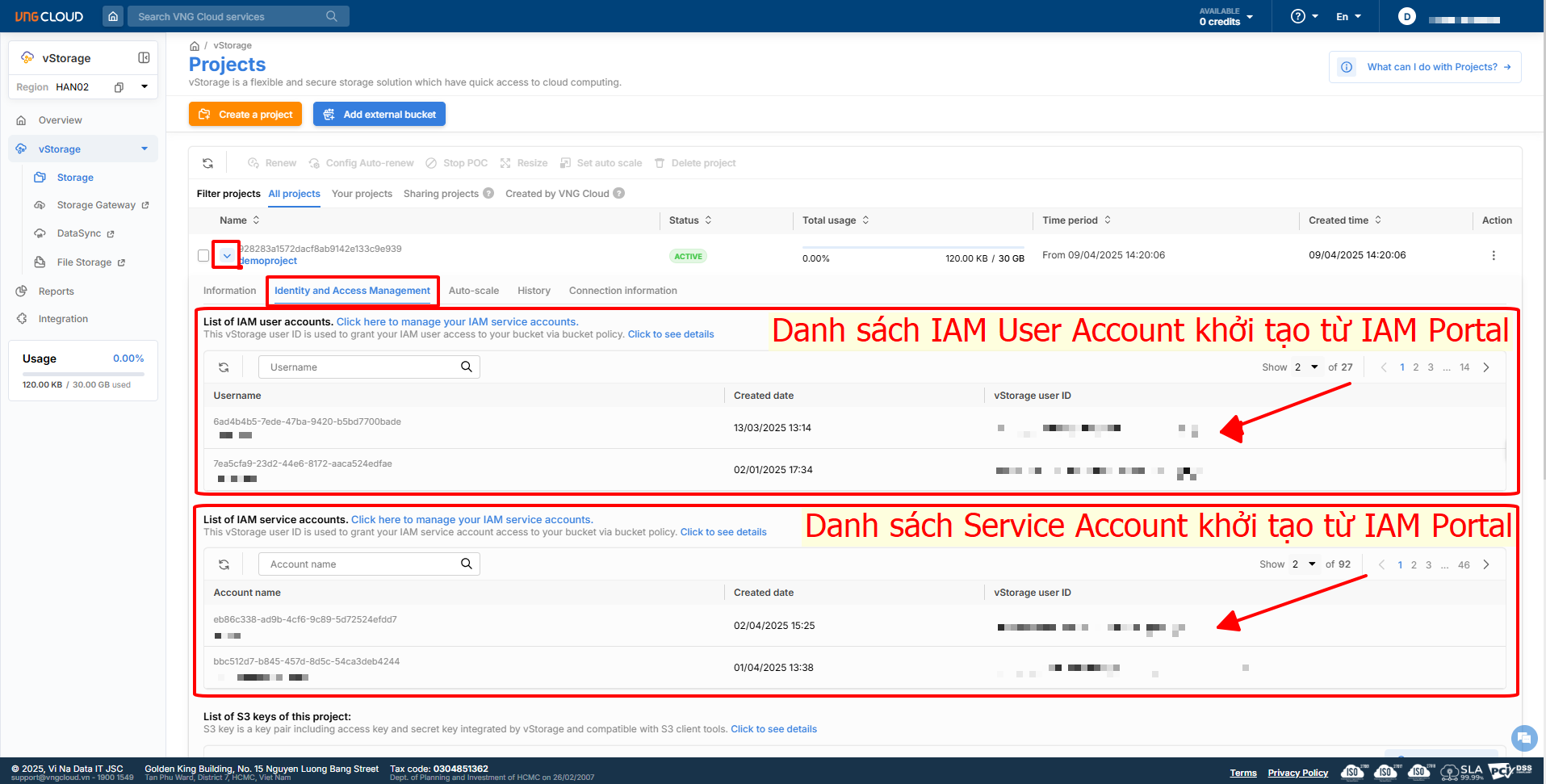 On region HAN02, you can use 4 types of accounts to access vStorage. Details of these 4 types include: