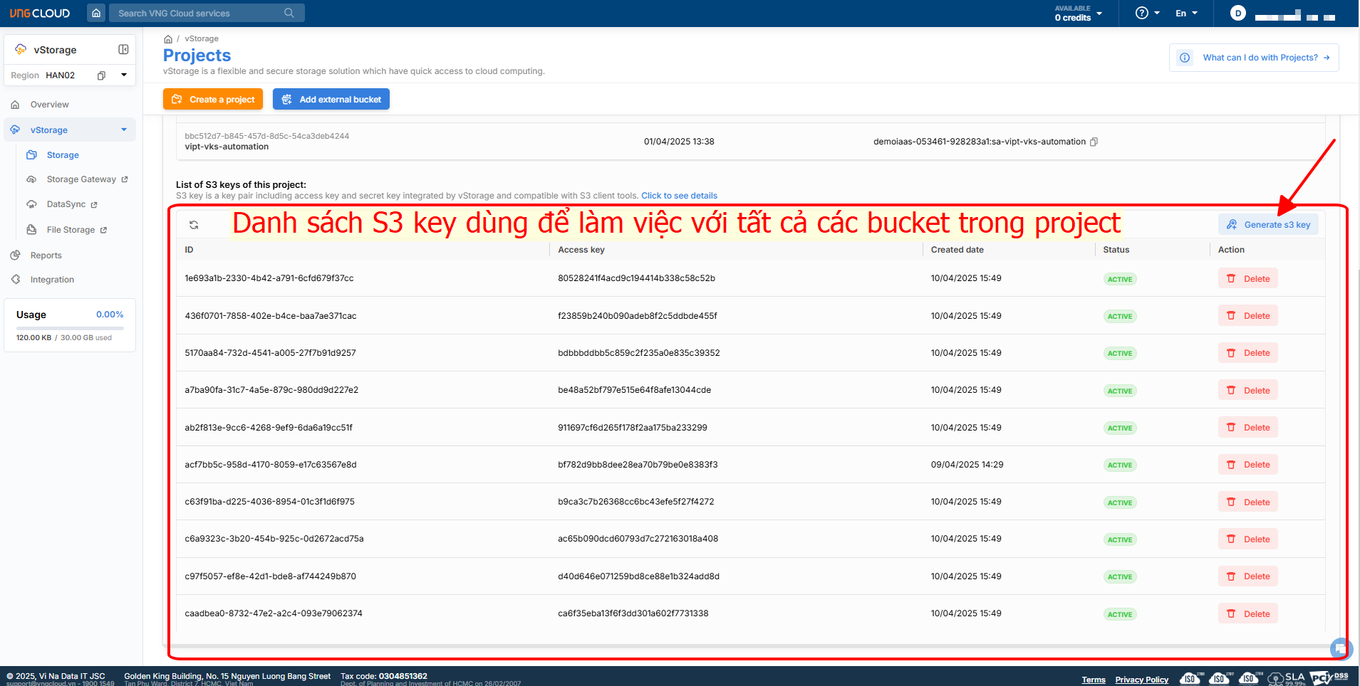 * **S3 keys:** Is a pair of s3 keys with access key and secret key integrated by vStorage for compatibility with S3 client tools such as s3cmd, s3 SDK,...